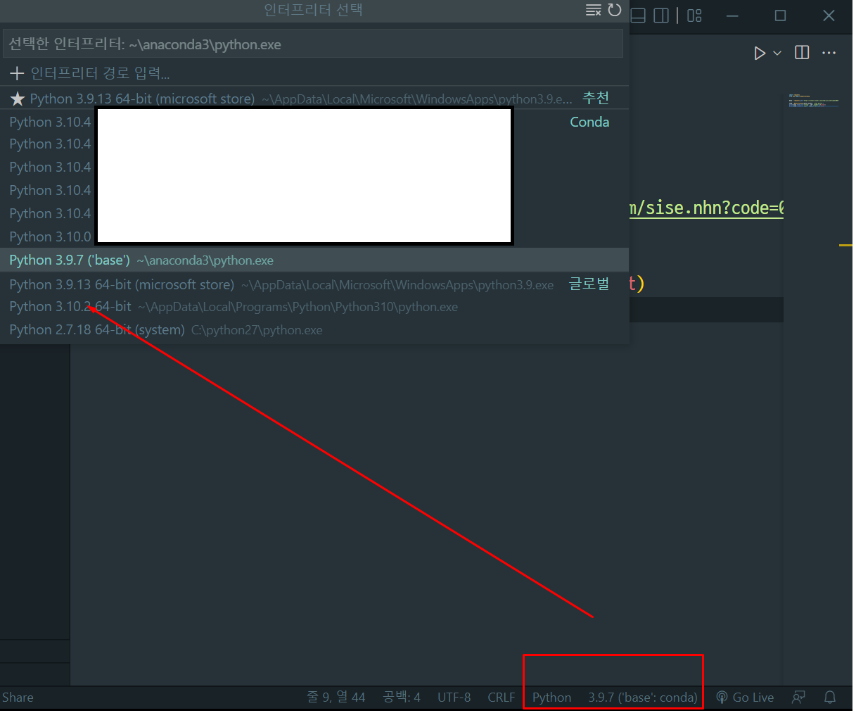 VSCODE 하단에 특정부분을 눌러서 Python interpreter를 변경 할 수 있다. (아래 그림 참조)