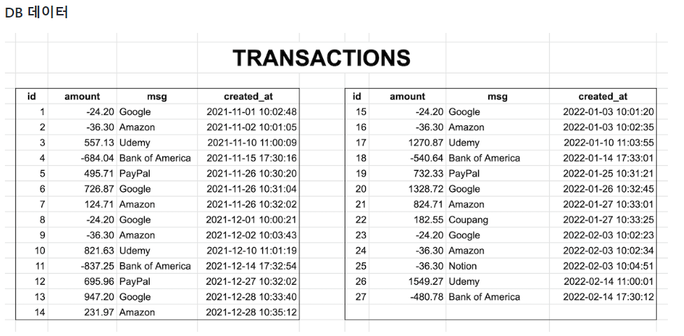 amount DECIMAL(12, 2), -- 거래 금액(총 12자리 숫자, 소수점 이하 2자리까지)