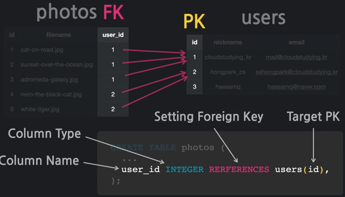 : 먼저 Column과 Type을 적은 다음에 해당 Column이 PK를 가르키도록 설정해줌 (Target PK)