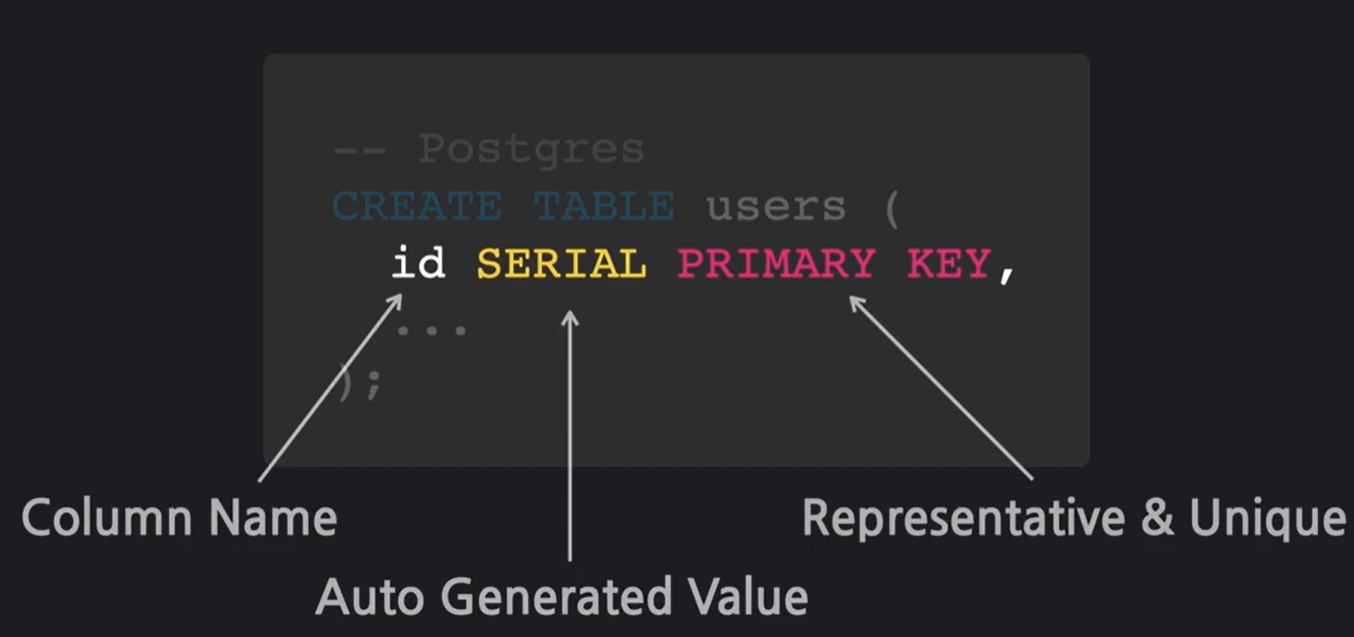 - Primary Key : 레코드를 대표하는 값 일종의 identification ( == 주민등록번호)