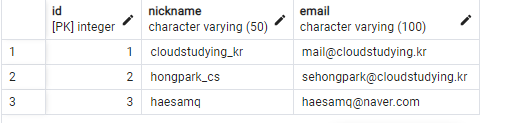 users(nickname, email) -- nickname과 email만 넣어줌(id자동)