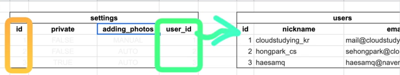 setting table을 만들고, 기존에 user table과 아래와 같이 연결