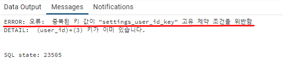 여기서, user_id 가 3인 데이터를 추가로 입력하려고 시도 할 경우 error가 발생한다.
