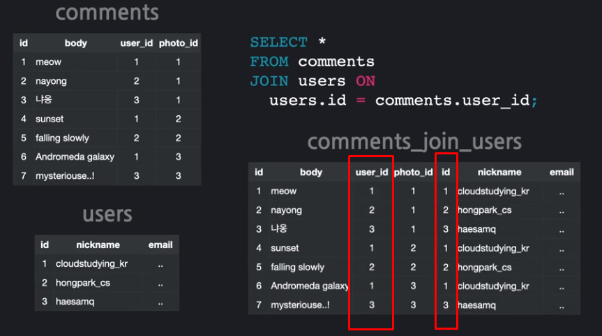 아래 쿼리는 사용자(users)와 댓글(comments) 정보를 합쳐준다.