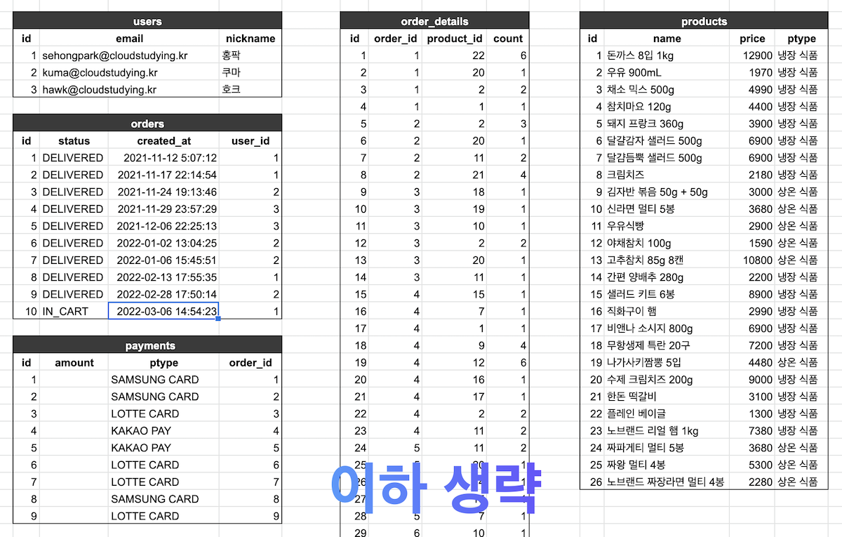 - 미션 : 다음 자료는 최근 4개월간 홍팍이와 동료들이 사용한, 마켓컬리의 데이터들이다. 준비 과정을 따라 이를 실제 DB로 만들고, 주어진 조인 문제를 푸시오.