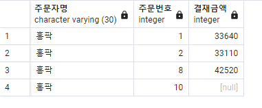 -- 3. 홍팍이의 모든 주문별 결재금액을 다음과 같이 조회하시오