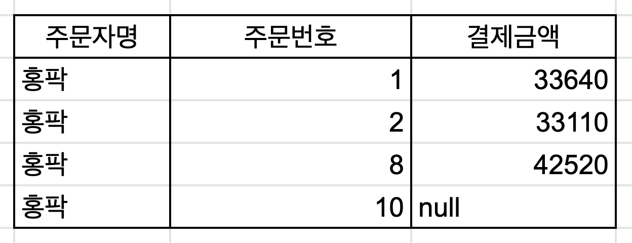 3. 홍팍이의 모든 주문별 결제 금액을 다음과 같이 조회하시오.