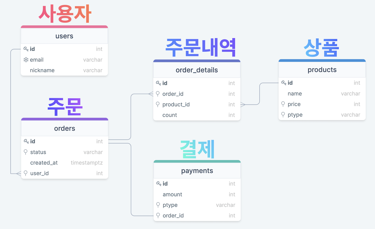 order_id INTEGER REFERENCES orders(id) -- FK: 결제된 주문