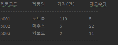 # print("%5s %15s %15s %5d" % (pCode, pName, price, amount))