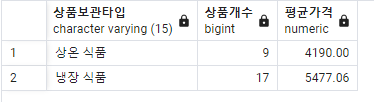-- 2. 상품 테이블을 보관 타입에 따라 분류하고, 각각의 상품 개수와 평균 가격을 조회하시오