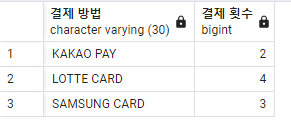 1. 결제(payment) 테이블을 결제 방법에 따라 분류하고, 각각의 결제횟수를 조회하시오