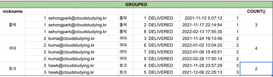 - GROUP BY 쿼리에서 명시한 column을 기준으로 분류를 한다.