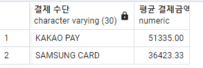1. 결재(payments) 테이블에서 수단별 평균 결제 금액이 다음과 같을 때, 평균 결제 금액이 36,000원 이상인 것만 조회하시오