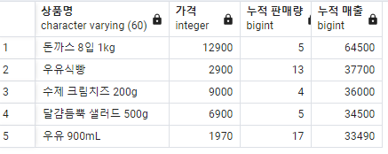 (d) 누적 매출 상위 5개 상품을 조회하시오