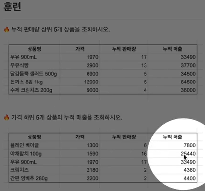 -- (d) 누적 매출 상위 5개 상품을 조회하시오