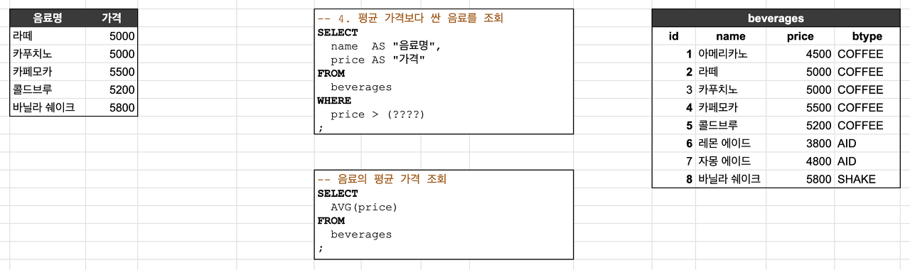 -- 먼저 beverages table에서 음료의 평균가격을 구해보자