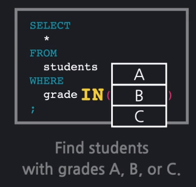 만약, Sub query가 단일 column A B C를 가지고 있다면, grade가 A,B,C 안에 있는 학생만 Filter한다.