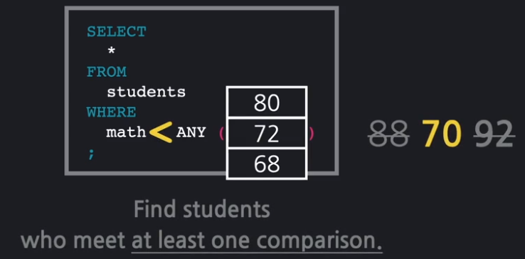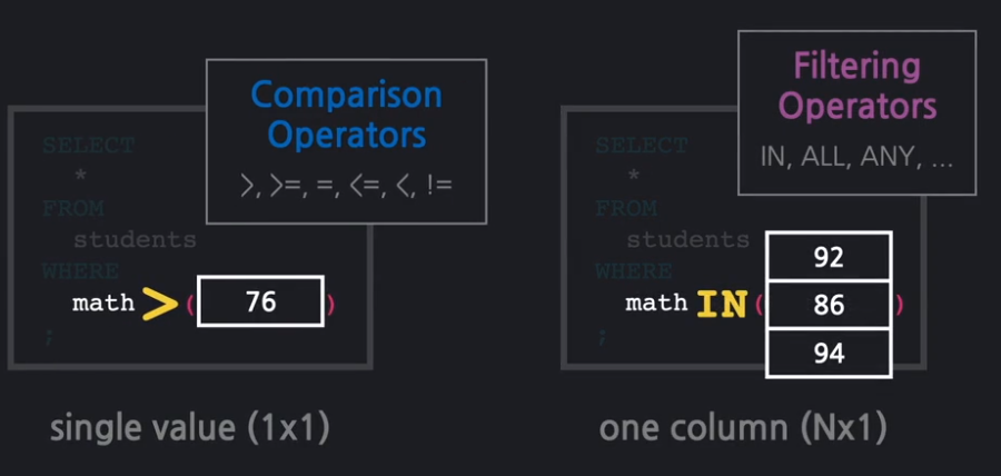 Sub query가 단일 column 80, 72, 68을 가지고 왔다면, main query에서는 비교연산을 통해서