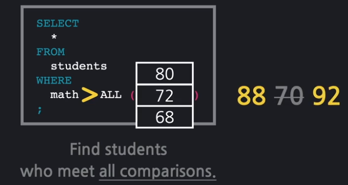 만약, Sub query가 단일 column 80, 72, 68을 가지고 왔다면, 이것을 가지고 비교연산을 ALL과 함께 진행하는데