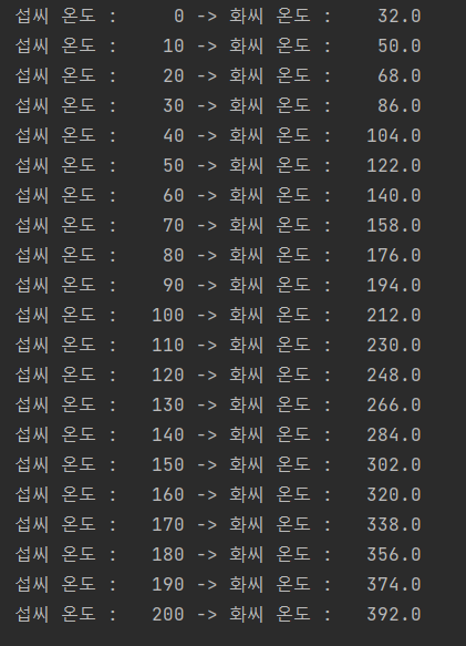 # 10도 단위로 증가시키면서 대응되는 섭씨 온도 출력