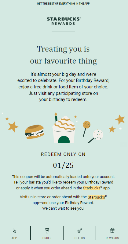 스타벅스는 생일 당일에만 redeem 할 수있는 메시지가 오게되는데,